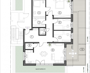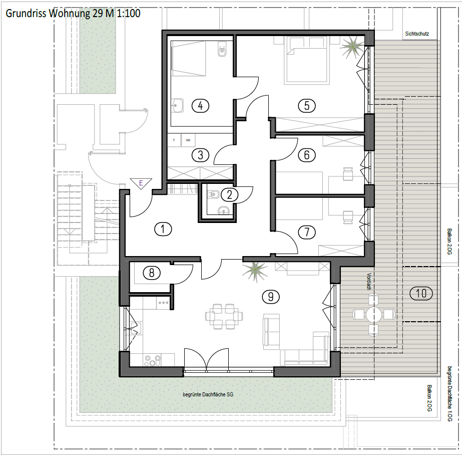 Diese großzügige Wohnung im Staffelgeschoss des Kastanienhofs bietet ein hochwertiges Wohnkonzept mit klarer Struktur, viel Raum und einer ausgewogenen Aufteilung zwischen gemeinschaftlichen Bereichen und privaten Rückzugszonen. Der Grundriss ist funktional gegliedert und auf komfortables Wohnen im Alltag ausgelegt.