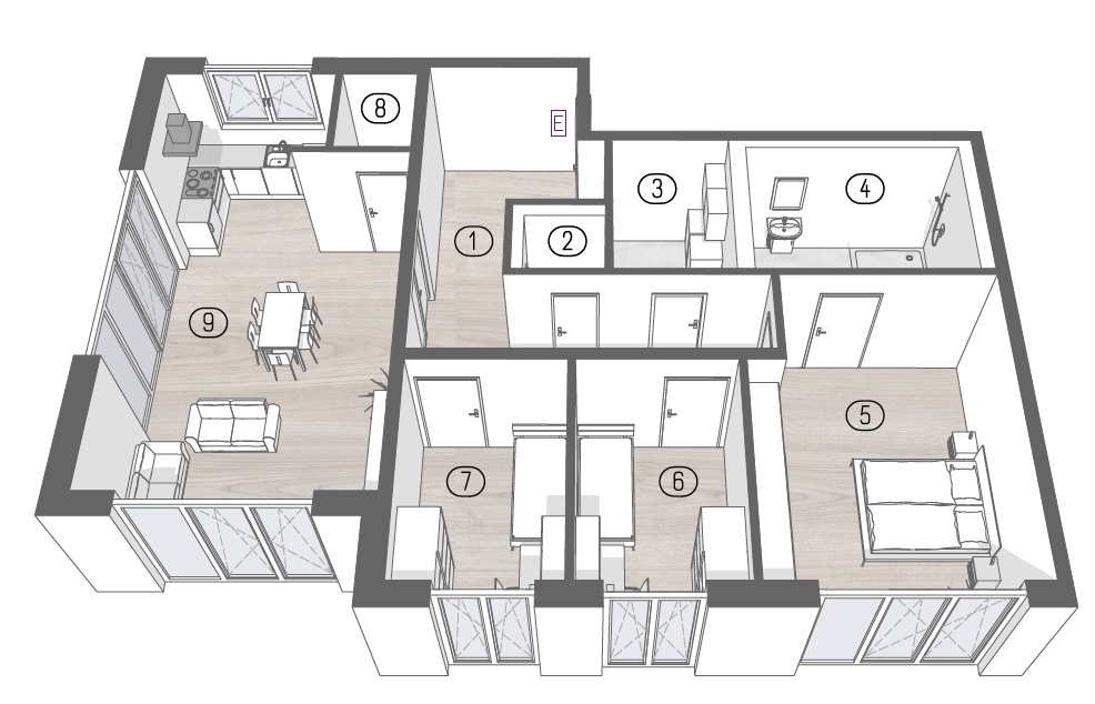 Der großzügige Flur mit Garderobenbereich bildet das zentrale Element der Wohnung und sorgt für Übersichtlichkeit. Ein separates WC, ein Hauswirtschaftsraum sowie ein zusätzlicher Abstellraum bieten hohen praktischen Nutzen und ausreichend Stauraum.