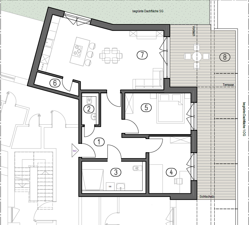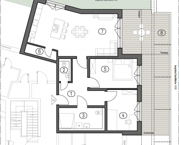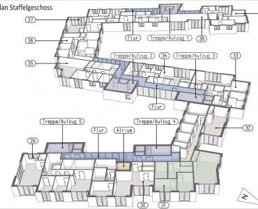 Diese gut geschnittene Wohnung im Staffelgeschoss des Kastanienhofs bietet ein ausgewogenes Wohnkonzept mit klarer Raumaufteilung, kurzen Wegen und einem angenehmen Bezug zum Außenbereich. Der Grundriss ist funktional gegliedert und auf komfortables Wohnen im Alltag ausgerichtet.