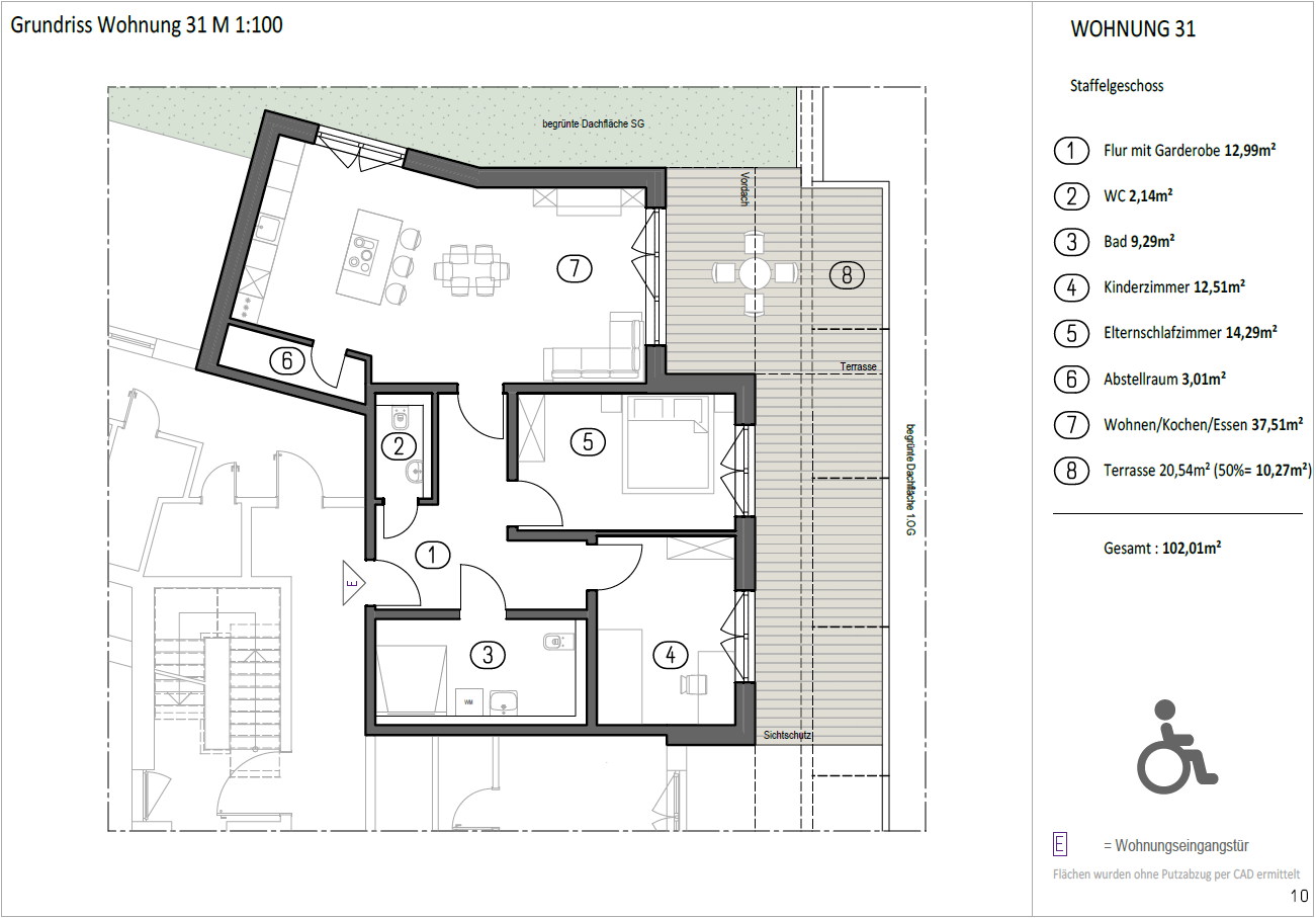 Mit rund 102 m² Wohnfläche bietet diese Wohnung ein komfortables, gut strukturiertes Wohnumfeld mit klarer Raumaufteilung, angenehmer Belichtung und hoher Alltagstauglichkeit. Die Lage im Staffelgeschoss verleiht der Wohnung einen besonderen Charakter und eine hohe Wohnqualität im Kastanienhof.