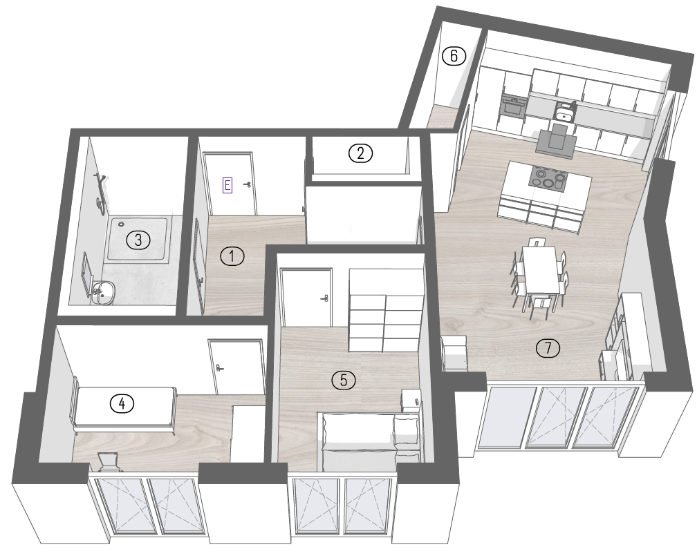 Der offen gestaltete Wohn-, Koch- und Essbereich mit rund 37,5 m² bildet den Mittelpunkt der Wohnung. Große Fensterflächen sorgen für viel Tageslicht und schaffen eine helle, offene Wohnatmosphäre. Der direkte Zugang zur Terrasse erweitert den Wohnraum nach außen und bietet Platz für entspannte Aufenthalte im Freien.