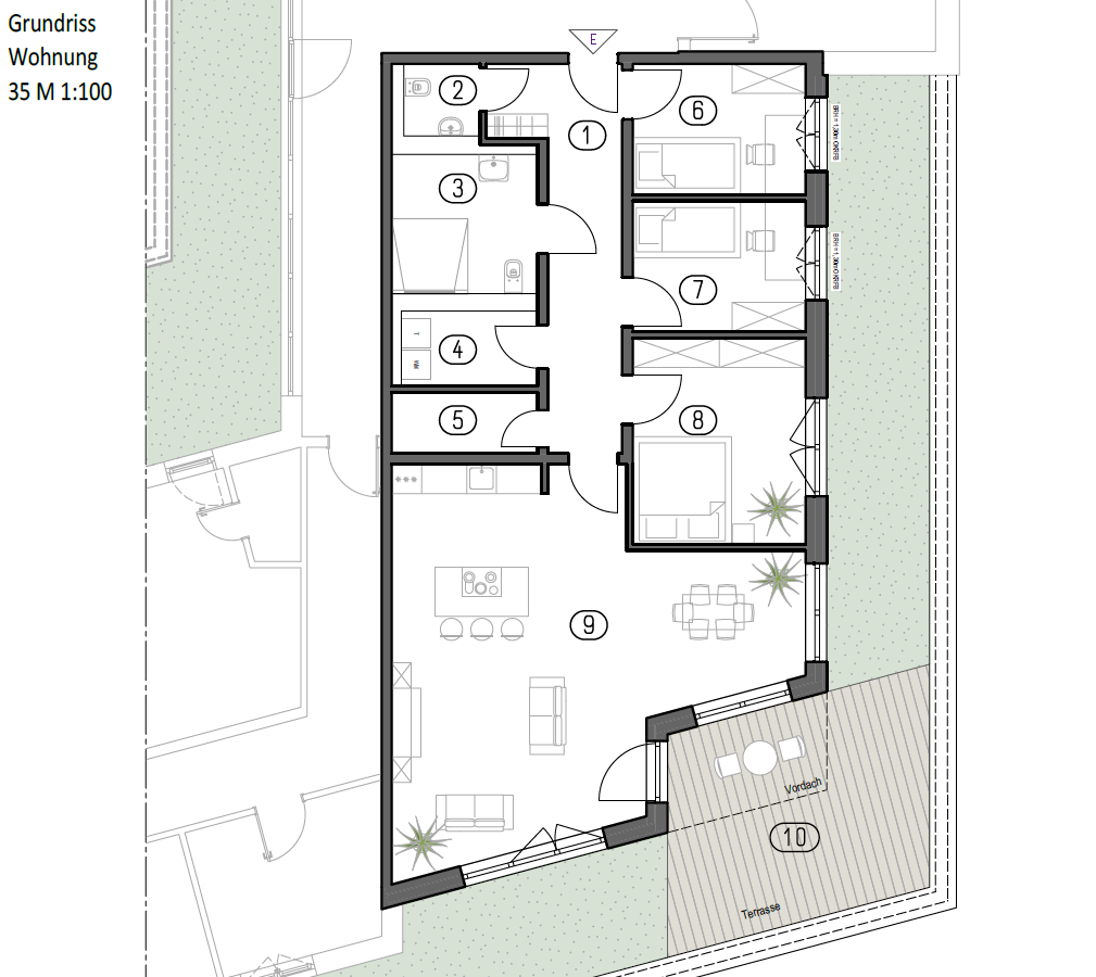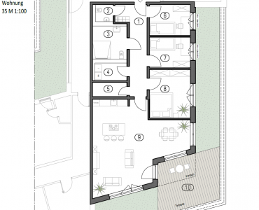 Der private Bereich umfasst ein Elternschlafzimmer sowie zwei Kinderzimmer, die gut proportioniert und flexibel nutzbar sind. Die klare Trennung zwischen Wohn- und Schlafbereichen unterstützt ein ruhiges, entspanntes Wohnen.
