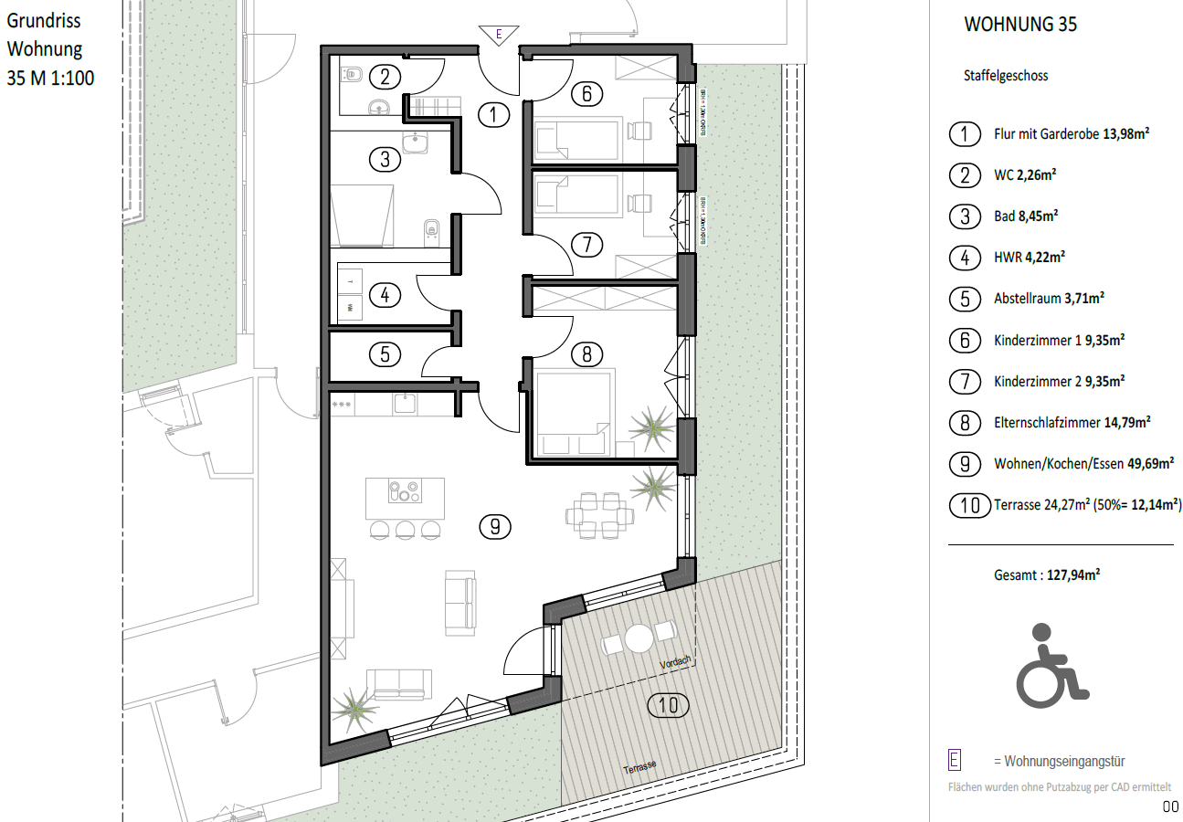 Mit rund 127,9 m² Wohnfläche bietet diese Wohnung ein komfortables, hochwertiges Wohnumfeld mit klarer Raumstruktur, viel Tageslicht und hoher Alltagstauglichkeit – ideal für langfristiges Wohnen im Kastanienhof.