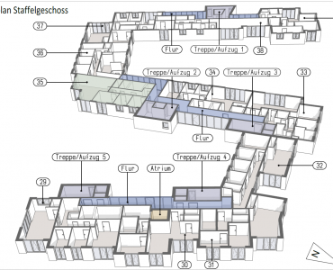 Diese hochwertig geschnittene Wohnung im Staffelgeschoss des Kastanienhofs bietet ein großzügiges, klar strukturiertes Wohnkonzept mit viel Raum für Alltag und Rückzug. Der Grundriss verbindet offene Wohnbereiche mit gut organisierten privaten Zimmern und funktionalen Nebenräumen.