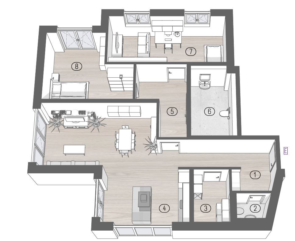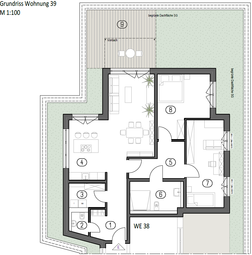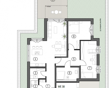 Der Mittelpunkt der Wohnung ist der offen gestaltete Wohn-, Koch- und Essbereich mit über 37 m². Große Fensterflächen schaffen eine helle, offene Atmosphäre und ermöglichen einen direkten Zugang zur umlaufenden Terrasse. Die Raumgröße erlaubt flexible Möblierung und unterschiedliche Wohn- und Esssituationen.