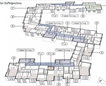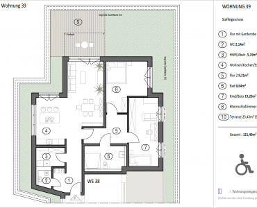 Ein besonderes Highlight ist die großzügige Terrasse mit über 23 m² Fläche, die den Wohnraum nach außen erweitert und vielfältige Nutzungsmöglichkeiten bietet – vom ruhigen Rückzugsort bis zum Platz für geselliges Beisammensein. Die Lage im Staffelgeschoss sorgt für ein hohes Maß an Privatsphäre und eine besondere Wohnqualität.