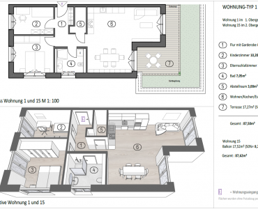 Wohnung 1 überzeugt durch einen klar strukturierten Grundriss, großzügige Raumproportionen und eine hochwertige Außenfläche. Mit einer Gesamtwohnfläche von ca. 87,5 m² bietet sie ein komfortables Zuhause für Paare, kleine Familien oder anspruchsvolle Eigennutzer.
