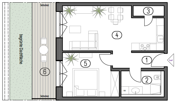 Die Terrasse erweitert den Wohnraum nach außen und bietet Platz für Sitzmöglichkeiten im Freien. Sie schafft zusätzliche Aufenthaltsqualität und unterstreicht den offenen Charakter der Wohnung.