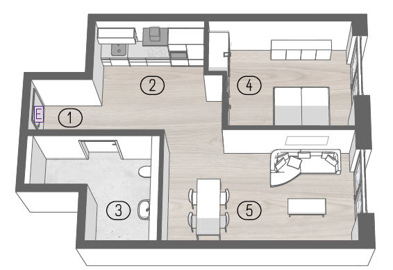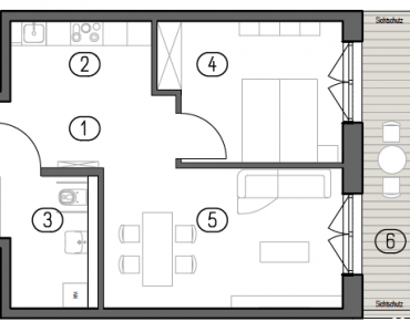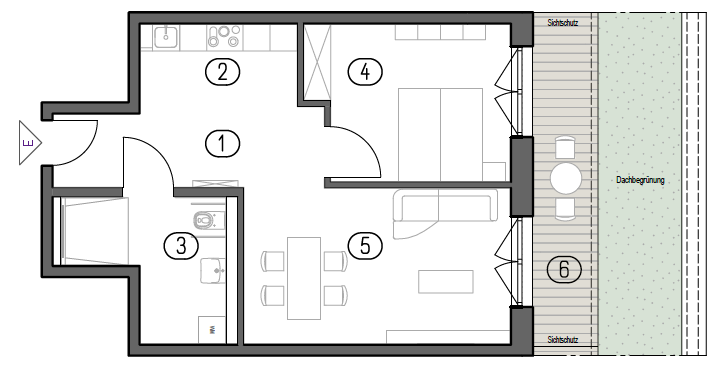 Der Mittelpunkt der Wohnung ist der offen gestaltete Wohn- und Essbereich, der durch seine klare Geometrie vielseitige Möblierungsmöglichkeiten bietet. Große Fensterflächen sorgen für eine helle, angenehme Wohnatmosphäre und verbinden den Innenraum direkt mit dem Außenbereich.