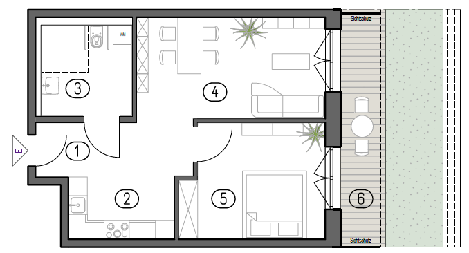 Die Wohnung verfügt über eine Terrasse, die den Wohnraum sinnvoll erweitert und Platz für Sitzmöglichkeiten im Freien bietet. Sie schafft zusätzliche Aufenthaltsqualität und unterstreicht den offenen, modernen Charakter der Wohnung.