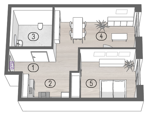 Der Wohn- und Essbereich bildet den Mittelpunkt der Wohnung und bietet trotz kompakter Fläche eine angenehme Raumwirkung mit vielseitigen Möblierungsmöglichkeiten. Große Fensterflächen sorgen für gute Belichtung und eine direkte Verbindung zum Außenraum. Das Schlafzimmer ist ruhig gelegen und bietet ausreichend Platz für Bett, Schranklösungen und Bewegungsflächen.