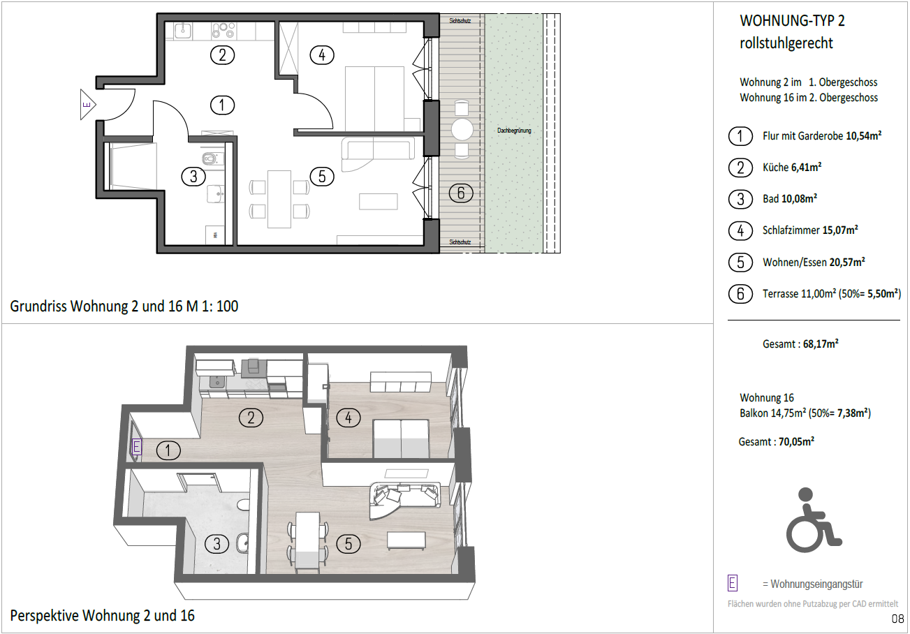 Mit einer Wohnfläche von ca. 68,17 m² (Wohnung 2)  verbindet dieser Wohnungstyp Komfort, Funktionalität und Zukunftssicherheit. Die barrierefreie Ausführung, die hochwertige Architektur des Kastanienhofs sowie die nachhaltige Bauweise bieten ein komfortables, zukunftsorientiertes Wohnumfeld mit hoher Wohnqualität für den Alltag.