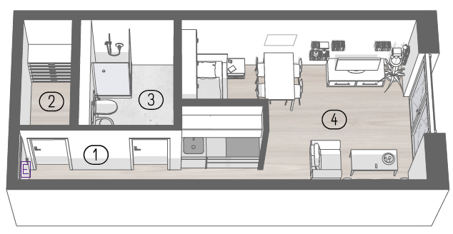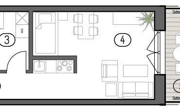Der kombinierte Wohn-, Koch-, Ess- und Schlafbereich bildet das Zentrum der Wohnung. Die offene Gestaltung ermöglicht flexible Nutzungsmöglichkeiten und schafft trotz der kompakten Größe ein angenehmes Raumgefühl. Große Fensterflächen sorgen für ausreichend Tageslicht und eine direkte Verbindung zum Außenbereich.