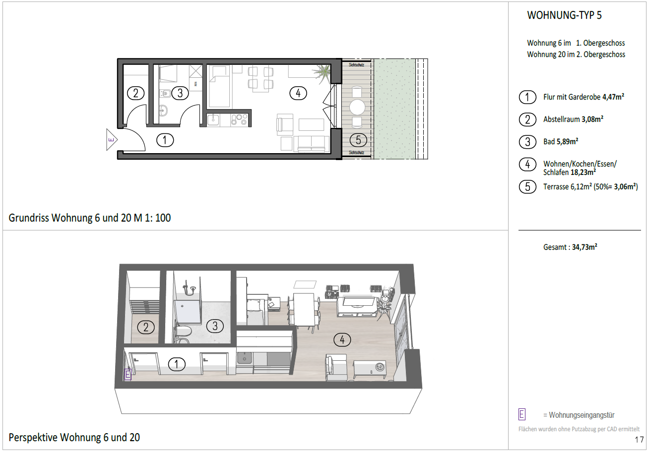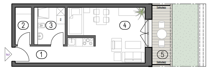 Mit einer Gesamtwohnfläche von ca. 34,73 m² überzeugt dieser Wohnungstyp durch hohe Flächeneffizienz, niedrige Einstiegskosten und sehr gute Vermietbarkeit. Er eignet sich ideal als Single-Apartment, Pendlerwohnung oder renditeorientierte Kapitalanlage innerhalb des nachhaltigen Gesamtkonzepts des Kastanienhofs.
