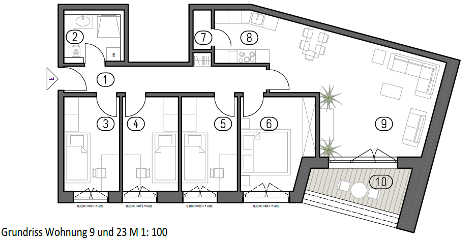 Der großzügige Wohn- und Essbereich mit über 31 m² bildet das Herzstück der Wohnung. Durch die besondere Grundrissgeometrie entsteht ein offenes, modernes Raumgefühl mit sehr guten Möblierungsmöglichkeiten. Große Fensterflächen sorgen für viel Tageslicht und den direkten Zugang zum Außenbereich.
