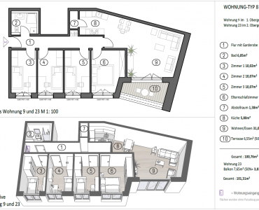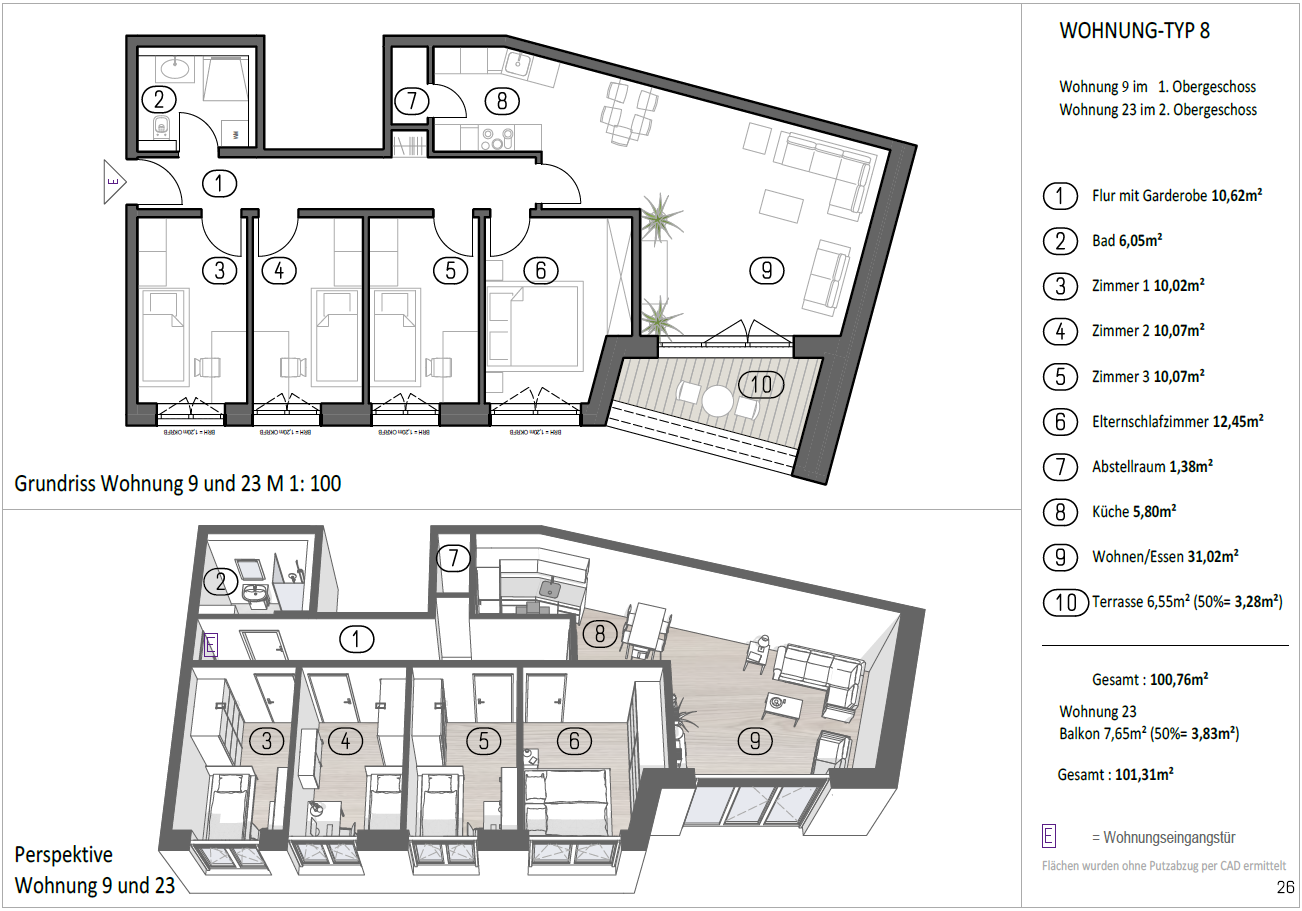 Mit einer Gesamtwohnfläche von ca. 101,31 m² zählt dieser Wohnungstyp zu den größten Einheiten im Objekt. Er überzeugt durch Großzügigkeit, eine klare Raumaufteilung und hohe Alltagstauglichkeit und bietet viel Platz für Familien oder Haushalte mit erhöhtem Raumbedarf. Der durchdachte Grundriss, die flexible Zimmeraufteilung und die nachhaltige Bauweise schaffen ein angenehmes und dauerhaft komfortables Wohnumfeld.