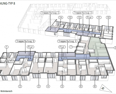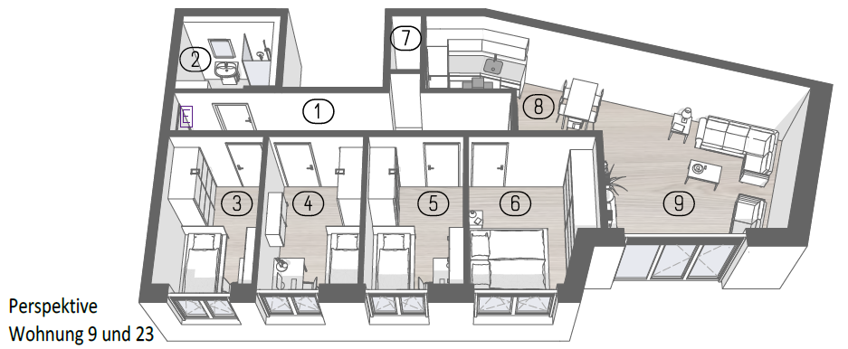 Diese großzügige 5-Zimmer-Wohnung im Kastanienhof richtet sich an Familien mit erhöhtem Platzbedarf oder an Nutzer, die Wohnen und Arbeiten unter einem Dach kombinieren möchten. Der Grundriss ist klar gegliedert, funktional durchdacht und bietet ein hohes Maß an Flexibilität.
